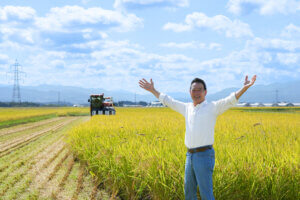 庄内平野の恵みをたっぷり受けた井上農場の稲がようやく収穫を迎えます。